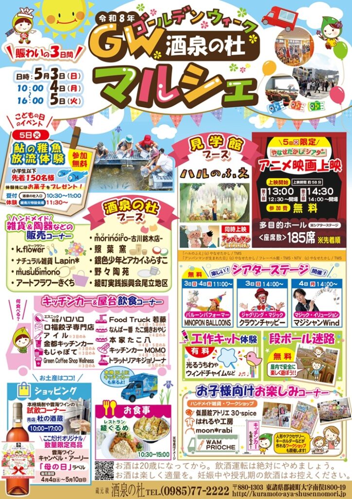ご家族そろって楽しめるイベントとなっておりますので、今年のゴールデンウィークはぜひ蔵元 綾 酒泉の杜でお楽しみください。