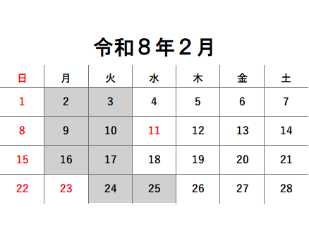 | 2026年 2月 | ・2日(月)・3日(火)・9日(月)・10日(火) ・16日(月)・17日(火)・24日(火)・25日(水) ※23日(月)は祝日のため営業、翌々日の25日(水)が振替の定休日となります。 |
